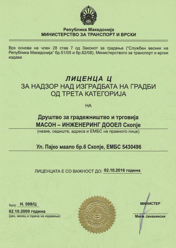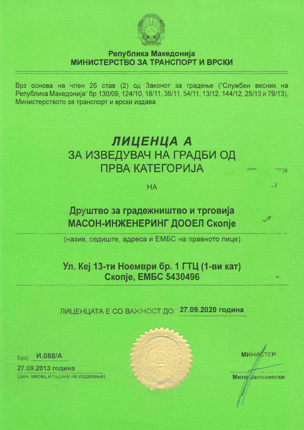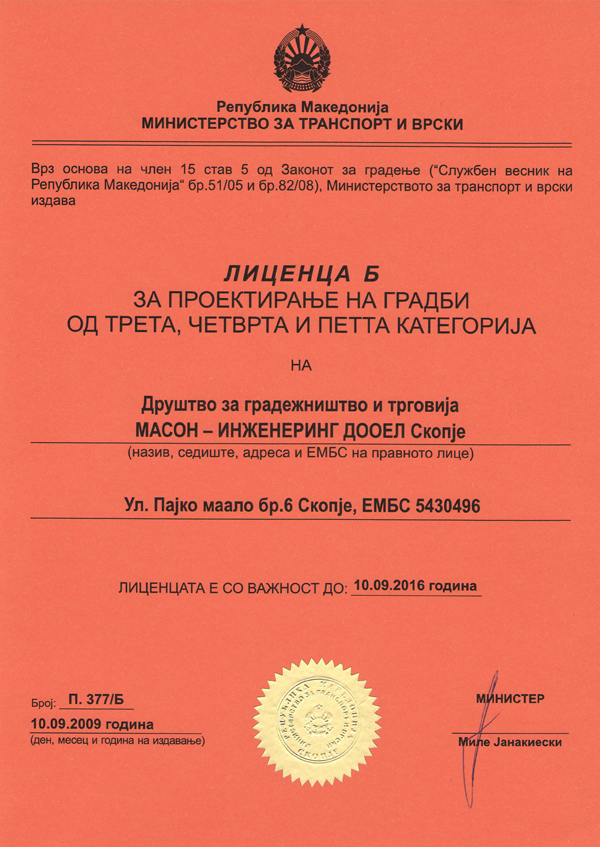According to the current legislation as prescribed by the provisions of the Construction Law, our construction company MASON-INZENERING Skopje meets the necessary requirements and accordingly has the following licenses required for conducting works in the field of civil engineering: